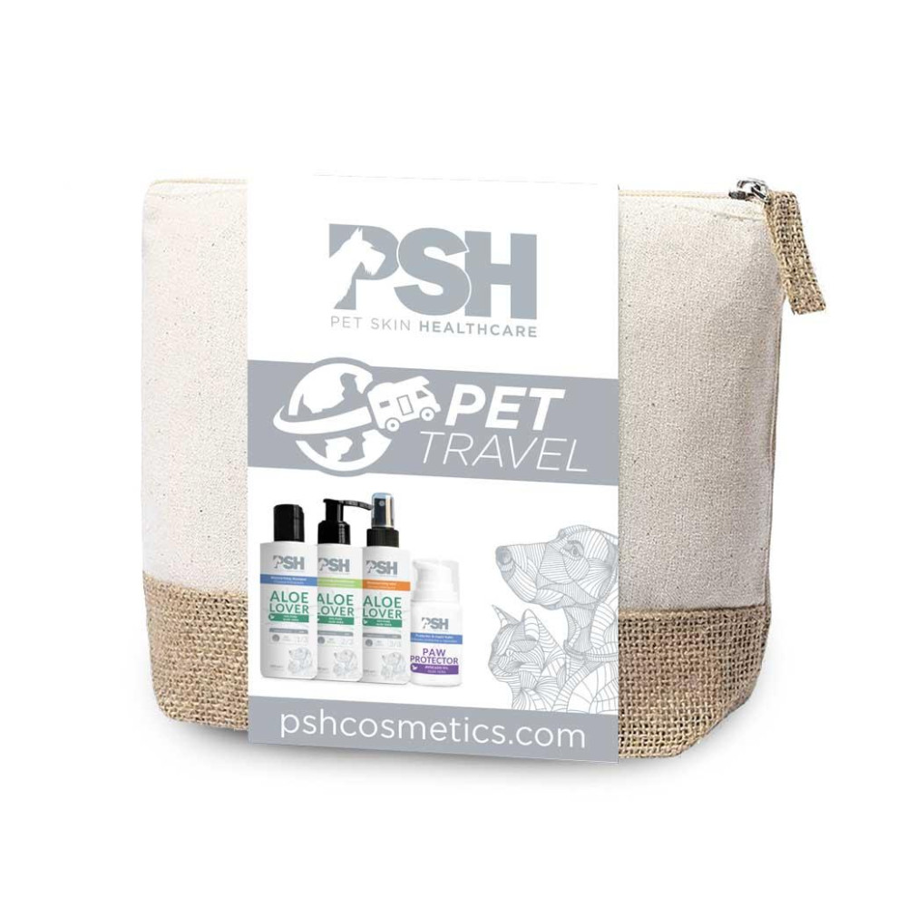 Necessaire com champô, condicionador, creme hidratante e protetor de patas, para cão e gato.