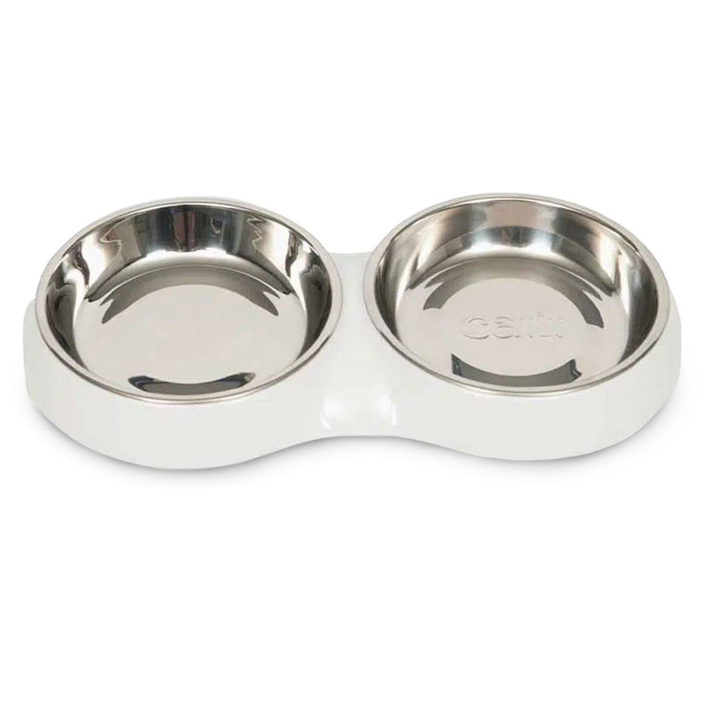 Comedouro duplo projetado para a alimentação dos gatos. O design raso permite que comam confortavelmente, sem tocarem com os bigodes na taça.