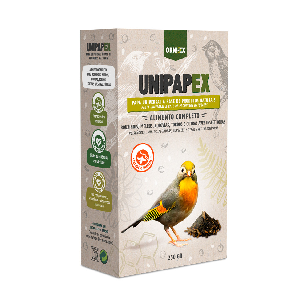 Papa à base de produtos naturais para aves insetívoras. Alimento completo que corrige as carências das aves em proteínas, vitaminas e elementos essenciais.