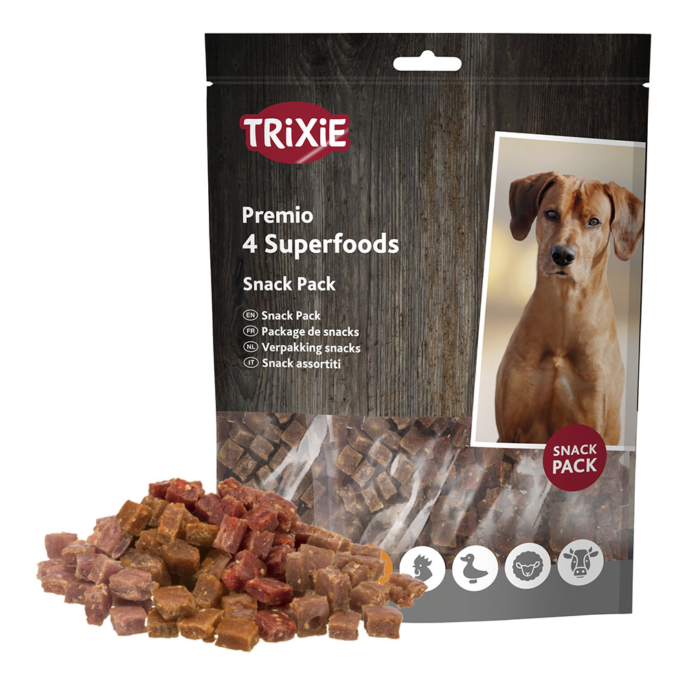 Os snacks Trixie Premio 4 Superfoods são ideais para dar ao animal entre as refeições, proporcionando-lhe uma grande variedade de sabores numa mesma embalagem: galinha, pato, vaca e cordeiro com mirtilos, bagas goji e coco, os quais favorecem o sistema imunitário.